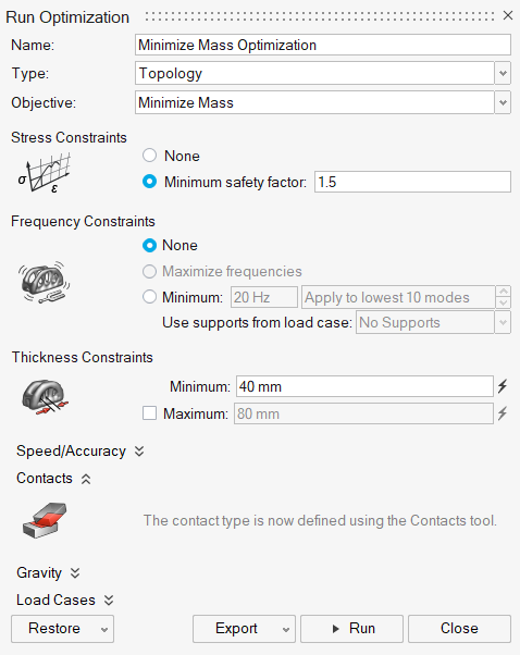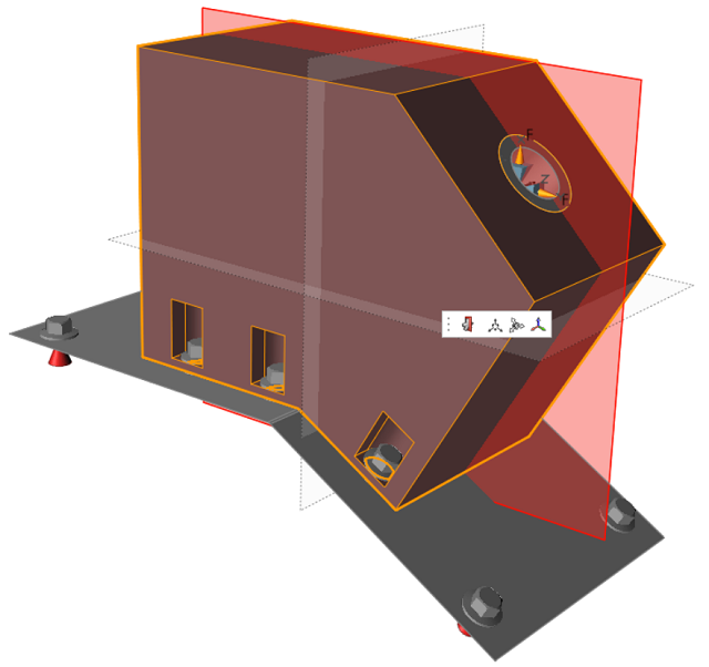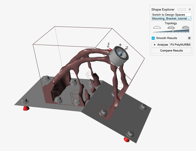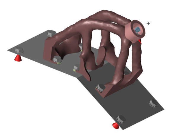 Set up a mounting bracket model and run topography optimization to minimize the mass