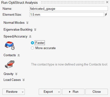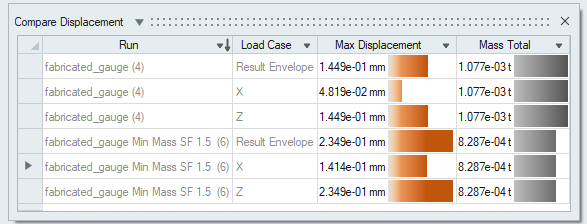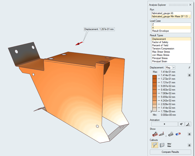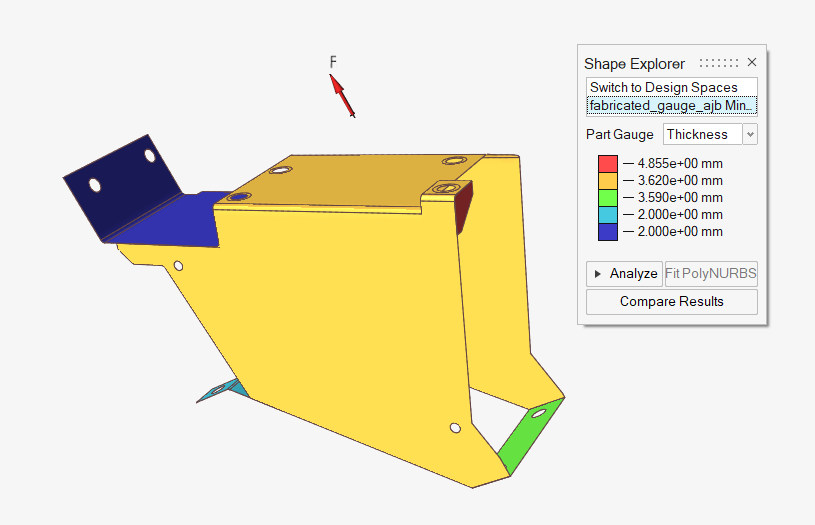 Gauge optimization is a type optimization that finds the optimal thickness of parts. This approach is ideal for minimizing the mass of an assembly. It can also be used to maximize stiffness or frequency of a model when using realistic design constraints like displacement constraints. Note that gauge optimization only works on parts that are defined by surface geometry.