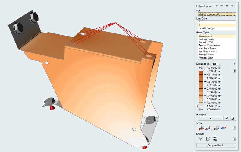 - Run a baseline analysis of a multi-part bracket assembly and view the results