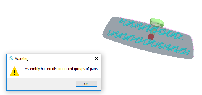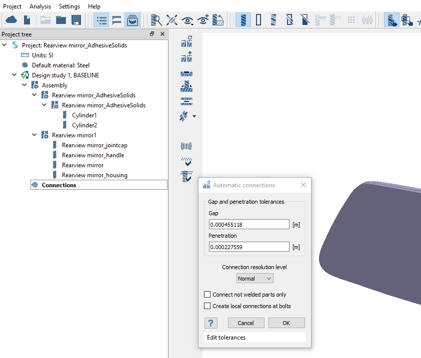 导入几何模型 点击 (从文件导入)图标。 Figure 5. 在打开几何体文件对话框中,按住 Control 键并同时选择Rearview mirror.x_b 和 Rearview mirror_AdhesiveSolids.x_b。 点击打开。 Figure 6. 自动连接对话框将在导入时打开。 使用默认的间隙和穿透容差创建自动连接。 Figure 7. 点击确定。 当出现断开的组警告时,点击确定即可将其关闭。 Figure 8.
