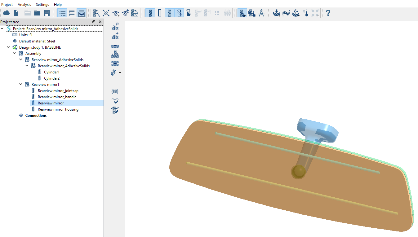 导入几何模型 启动新 SimSolid 会话。 点击从文件导入 。 Figure 2. 在打开几何体文件对话框中,选择 Rearview mirror.x_b。 点击打开。 装配将加载到模型视窗中。自动连接对话框将打开。