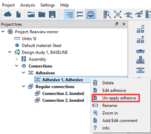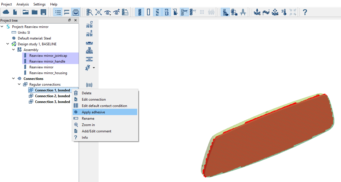 在连接区施加粘合剂 在项目树中,右击连接 1,并从右键菜单中选择施加粘合剂。 在施加材料对话框中,扩展通用材料文件夹并选择粘合剂。 Figure 3. 点击施加于选中的连接。 在项目树中,连接 1 被替换为粘合剂 1。会创建一个新的粘合剂文件夹。 Figure 4. 点击确定 关闭应用材料对话框。 点击 关闭项目。