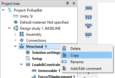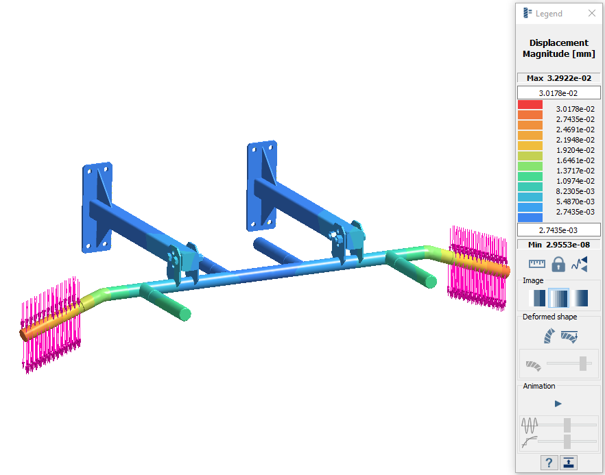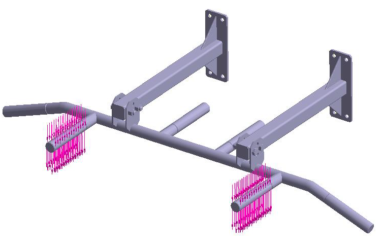 零件 1:创建设计研究 1 导入几何模型 启动新 SimSolid 会话。 点击从文件导入 。 Figure 1. 在打开几何体文件对话框中,选择 Pullup bar V1.x_t。 点击打开。 装配将加载到模型视窗中。将弹出信息窗口,警告检测到重叠零件。还将打开查看重叠零件对话框。 关闭信息对话框,然后关闭查看重叠零件窗口。 创建连接 在项目树中,点击连接分支。 在连接工作台工具栏,点击 (自动连接)。 将间隙和穿透容差指定为1。 将连接分辨率级别设置为增强。 点击确定。 Note: SimSolid 即使在几何体重叠的区域也会创建连接。 SimSolid 会自动识别螺栓、螺母和垫圈。 滑动接触会自动施加于螺栓杆,否则会施加绑定接触。 分配材料 在项目树中,点击装配分支。 在工作台中,点击 (施加材料)。 从通用材料列表中选择钢。 点击施加于所有零件。 点击关闭。在项目树的装配分支中,将识别每个零件的材料属性。 创建结构线性分析 在主窗口工具栏上,点击结构分析 > 结构线性。新分析会显示在项目树中的设计研究 1 下,分析工作台会打开。 创建固定支座 在分析工作台中,点击固定支座 。 Figure 2. 在对话框中,确认已选中面单选按钮。 在模型视窗中,选择 Figure 3 中显示为橙色的两个面。 Figure 3. 点击确定。新约束,固定 1 会出现在项目树中。约束的可视表示会显示在模型上。 创建力载荷 在分析工作台中,点击 (力/位移)。 Figure 4. 在对话框中,确保已选中面单选按钮。 在模型视窗中,选择 Figure 5 中显示为橙色的两个手柄面。 Figure 5. 将 Z 方向的力指定为 -750 N。 点击确定。新载荷,力/位移1,出现在项目树中。表示载荷的矢量会显示在模型上。 创建第二个结构线性分析 在项目树中,右击结构 1。 从右键菜单中选择复制。 结构 2 分析会显示在项目树中。 Figure 6. 点击结构 2 旁边的 即可扩展分析分支。 编辑手柄载荷。 双击载荷/位移。结构 2 下的 1。 Figure 7. 在力/位移对话框中,选择当前所列的面并选择删除。 在 模型视窗 中,选择两个前手柄面。 Figure 8. 点击确定。表示载荷的矢量会显示在模型上。 Figure 9. 工况 1 Figure 10. 工况 2 运行设计研究 求解设计研究中的所有分析。 在项目树中,选择设计研究1分支。 点击运行所有分析 . 在求解管理器中,确认已选择所有分析。 点击求解。 SimSolid 会运行设计研究分支中的所有分析。结束后,每个分析的结果分支将显示在项目树中。Note: 分析 1 在 11 秒内运行。SimSolid 会重复使用分析 2 的模型数据结构,因此分析会运行得更快。 将结果与书签进行比较 在项目树中,选择分析 1 的结果分支。 在分析工作台上,点击 (结果图)。 选择位移大小图。 在图例窗口中,点击 (显示变形形状)。 模型视窗会更新以显示所选结果并展示选项。 点击 (捕捉书签)图标。 SimSolid 将当前在模型视窗中显示的数据另存为图像或动画,并在书签浏览器中显示缩略图。可以随时选择书签以在模型视窗中显示保存的视图。 Figure 11. 为分析 2 重复步骤 1 至 5。 使用书签浏览器在不同结果之间切换。