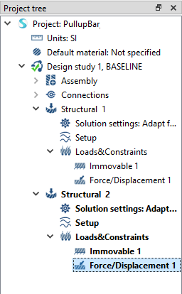 运行设计研究 求解设计研究中的所有分析。 在项目树中,选择设计研究1分支。 点击运行所有分析 . 在求解管理器中,确认已选择所有分析。 点击求解。 SimSolid 会运行设计研究分支中的所有分析。结束后,每个分析的结果分支将显示在项目树中。Note: 分析 1 在 11 秒内运行。SimSolid 会重复使用分析 2 的模型数据结构,因此分析会运行得更快。