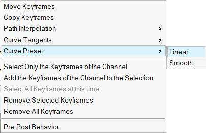 To define the pre-behavior and post-behavior for the Position, Rotation, and Scale channels, choose from: