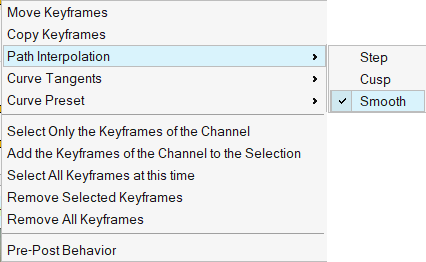disabled. For example, for the Position channel, using Linear means that the position is interpolated linearly (straight line) and using Smooth for means that the position is interpolated smoothing (curved smooth line). On the other hand, for Step, let's say there are two key frames, A and B. The object doesn't move between A and B like it does for linear and smooth types of interpolation. The object will disappear from A and appear at B.