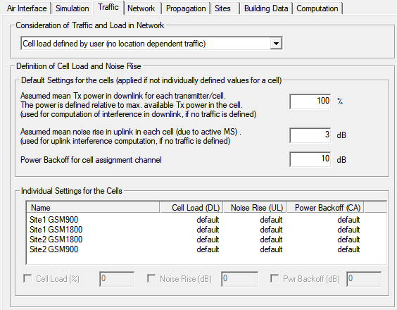 The default values for cell load, noise rise and power backoff can be defined in the upper section of the property tab. In the lower part all transmitters of the current project are listed and the settings for each transmitter are displayed in the table. The text Default indicates that a default values defined in the upper section of the dialog is used for the corresponding transmitter. If individual settings for a transmitter shall be defined the transmitter has to be selected in the table and the check- and edit boxes at the bottom of the dialog can be used to define individual values for cell load, noise rise and power backoff.