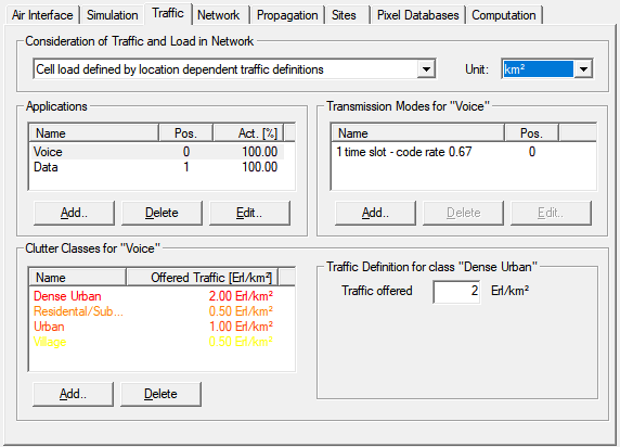 - Clutter classes contained in the database of the project which are assigned to the selected application. At least one clutter class is required to generate traffic for the defined application. If another application is selected by the user, the display of the clutter classes is refreshed automatically. Clutter classes can be added or removed with the buttons in the lower-left section.