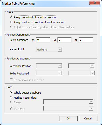 Besides this, database objects can also be fitted, adjusted by rotation, translation and scaling. Therefore at least four different marker points are required. Two markers indicate the destination location and the other two markers specify the starting point of the operations. After the marker points have been placed, an arbitrary one can be selected in order to open the Marker Point Referencing dialog via the context menu. Afterwards the mode Adjust two markers to the position of two other markers' has to be selected. In the section Position Adjustment', you can choose two marker points to be used as a reference position and two marker points which shall be transformed in order to be located on top of their corresponding reference later. Database objects which shall be transformed together with the marker points can be selected in the lower part of the dialog.