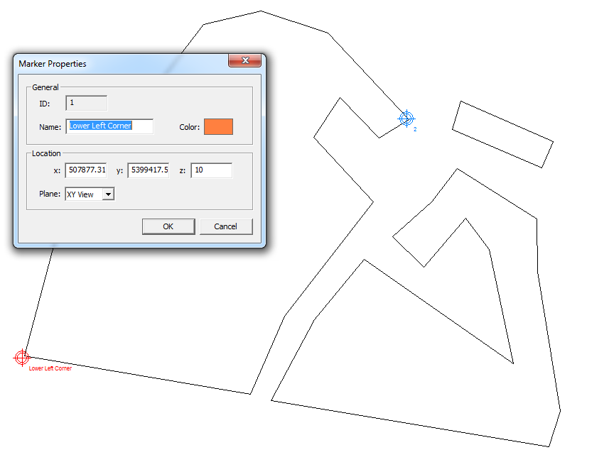 The properties dialog offers the possibility to change the name, the color and the location of a marker point.