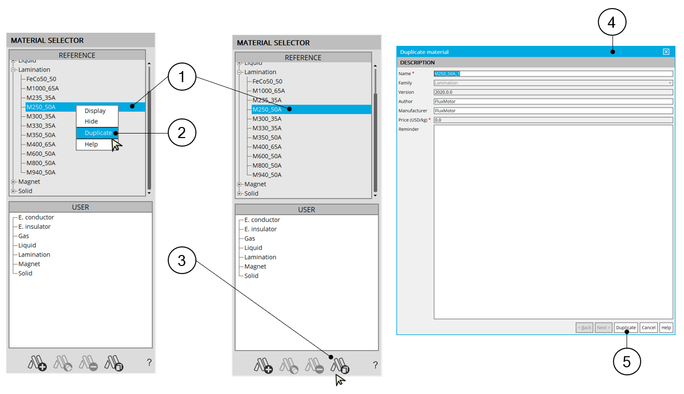 For any origin of the material (reference or user material database), the new material resulting from the duplication will be stored in the user material database.