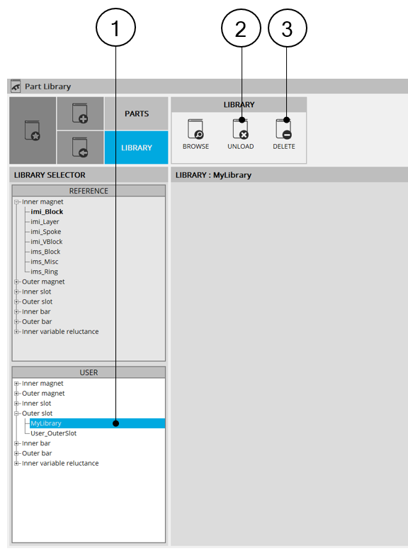 | 1 | Selection of the library to Unload or to Delete. |