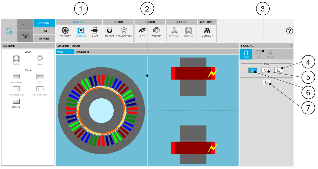 with the Housing: Frame, Fin and Cooling circuit. Note: By default, the section Frame is selected.