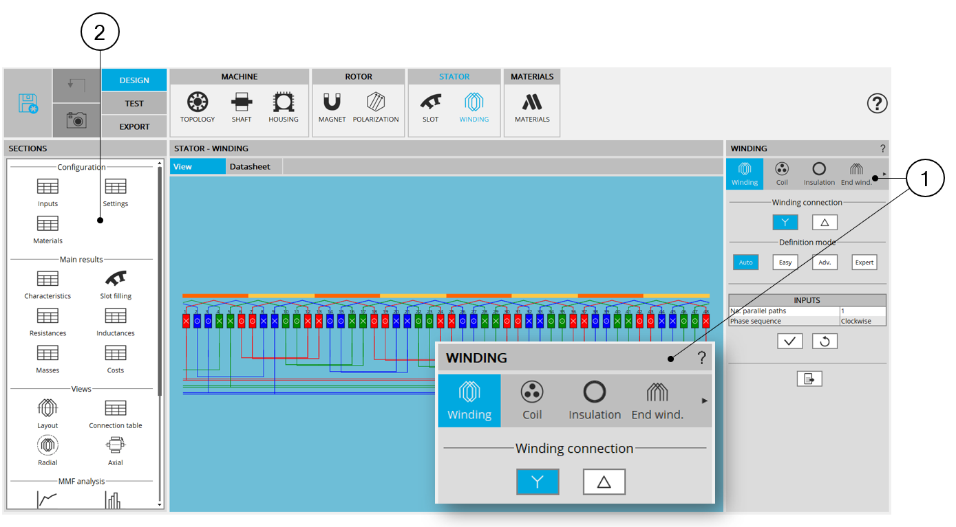 | 1 | Selection bar where Winding, Coil, End-winding and X-Factor sections can be selected |