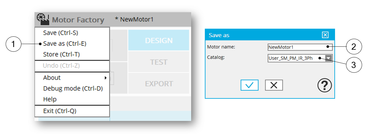User has to give a new name to the motor and select an existing catalog in which the motor will be stored.