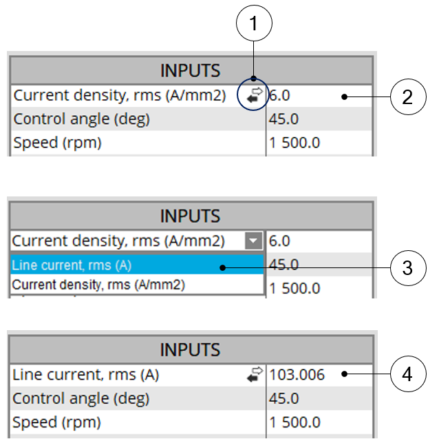 A process allowing Multiple choices for selecting the type of user’s inputs has been implemented. This allow to give users several choices within only one input line. Please see the below example showing the different ways to define the electrical current in conductors.