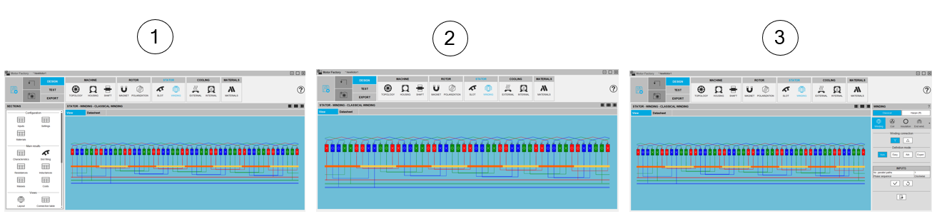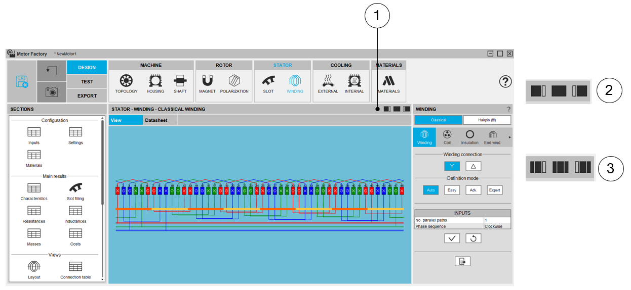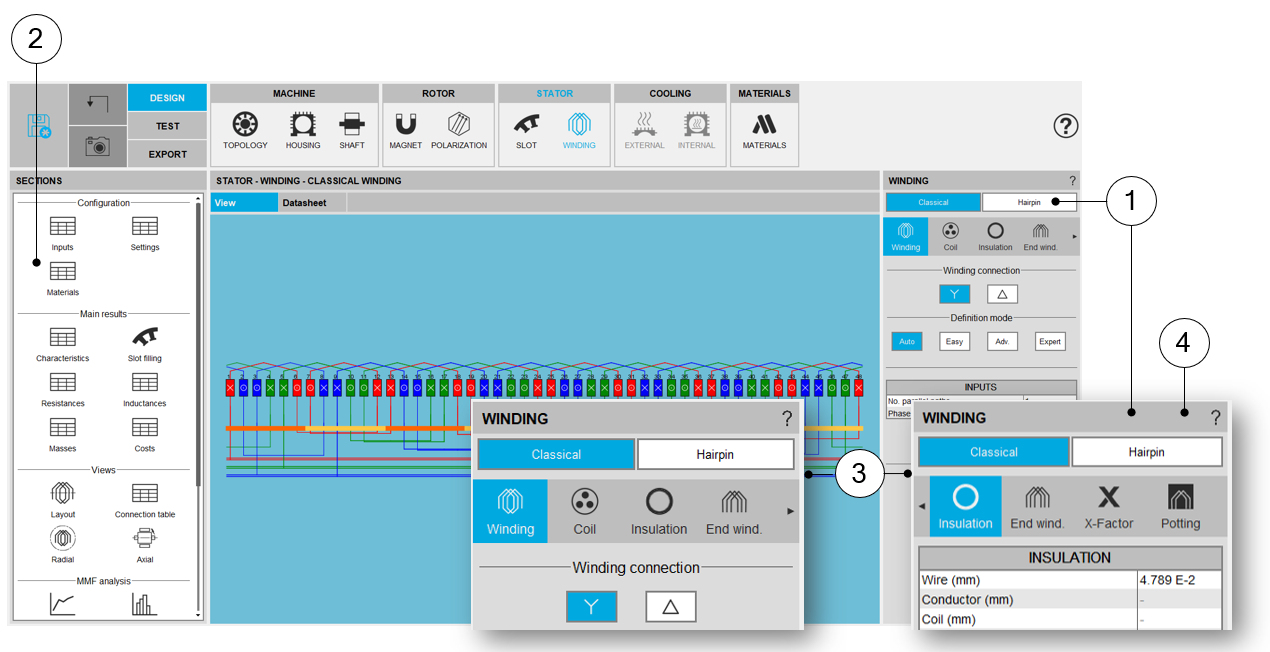 1 Scrolling selection bar where Winding, Coil, End-winding, X-Factor and Potting sections can be selected.