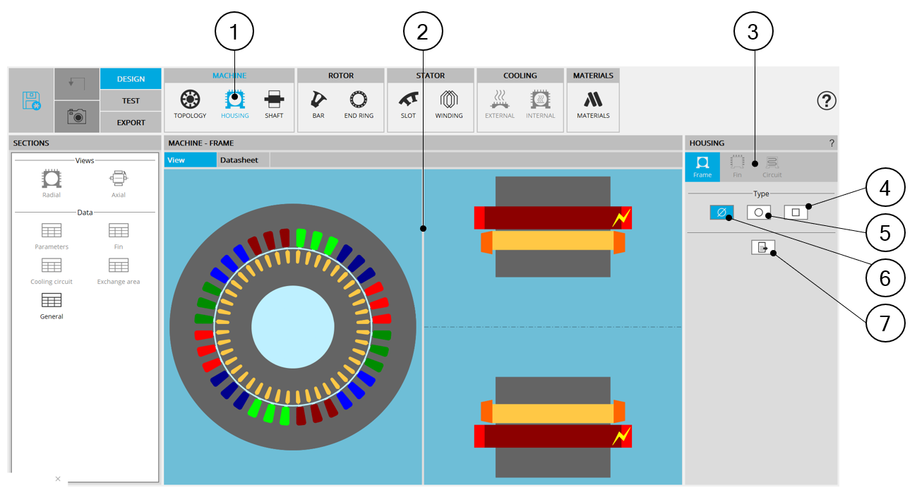 | 1 | Selection of the MACHINE subset: HOUSING panel (Click on the icon HOUSING) |
