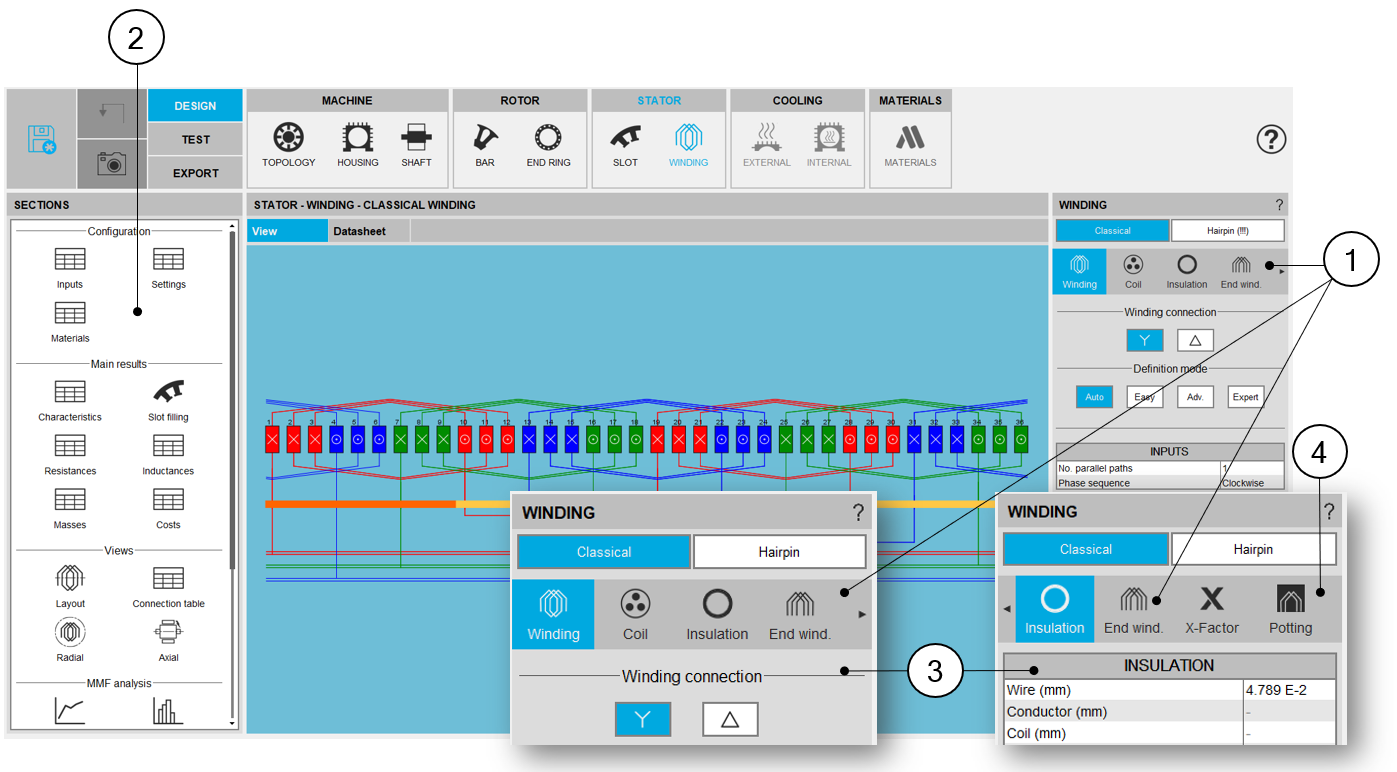7 A section scrolling bar allows choosing the section in which user inputs are defined.Scrolling selection bar where Winding architecture, Coil, Insulation, End-winding, X-Factor and Potting sections can be selected
