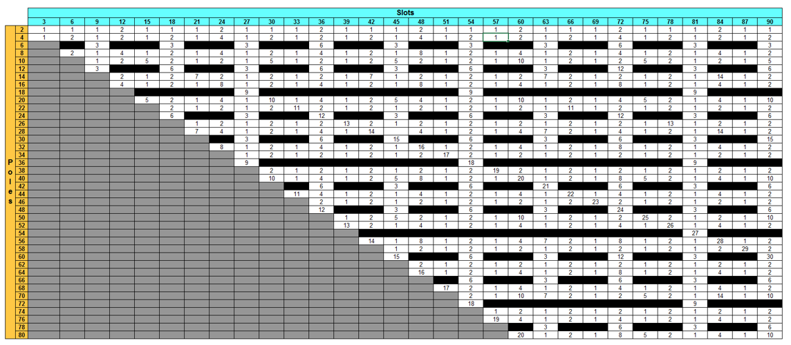 In this table the number of slots goes from 3 to 90 and the number of poles goes from 2 to 80.