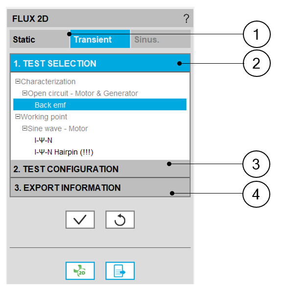 | 1 | Selection of application (STATIC or TRANSIENT) in which the model must be built for Flux® 2D |