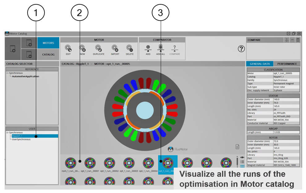All the motors resulting from the runs performed with Altair® HyperStudy® can be used back in Motor Catalog of Altair® FluxMotor® and then they can be edited in Motor Factory very quickly.