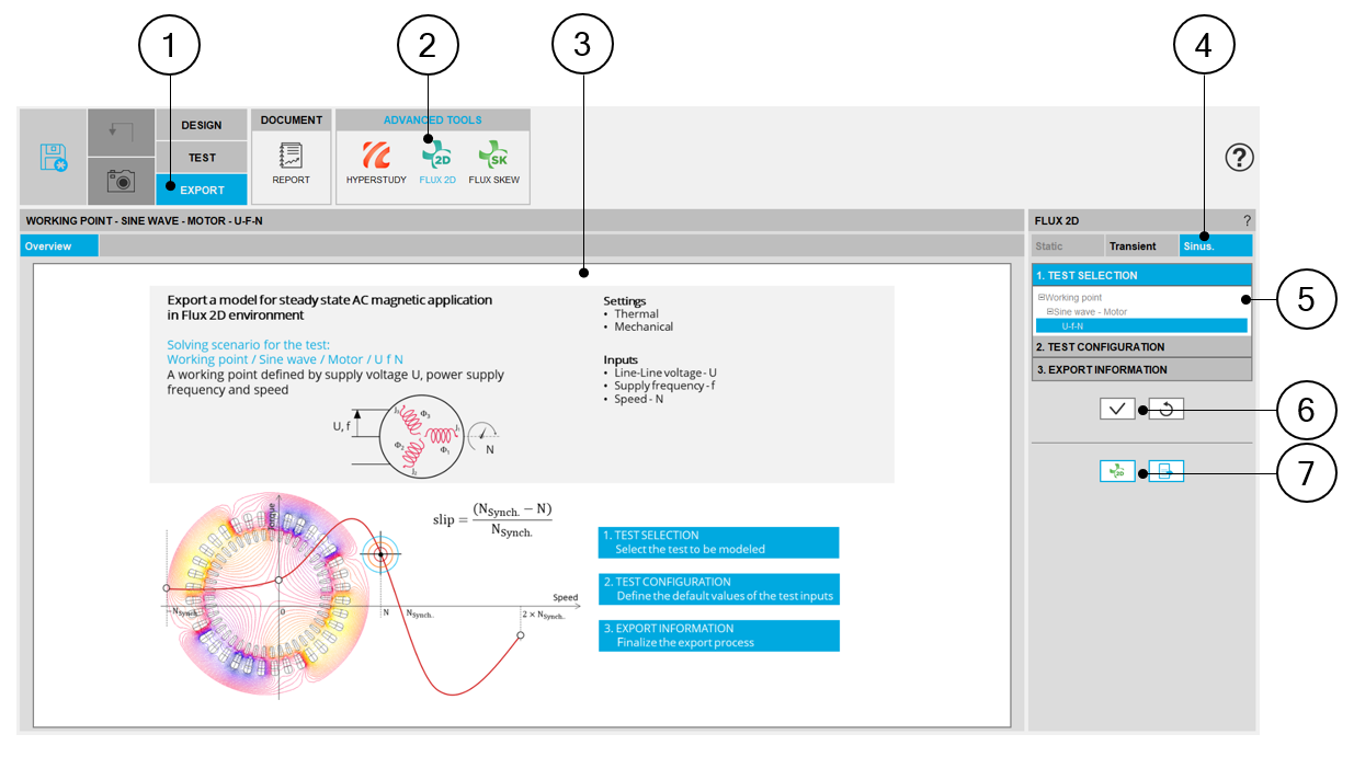 | 1 | Selection of application (SINUS or TRANSIENT) in which the model must be built for Flux® 2D |