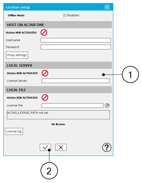 - Click on the apply button (Mark 2 - Figure 4 – License via Altair One - Dialog box). The status changes to ACTIVATED when the license is validated, or you will receive an error message if unsuccessful.