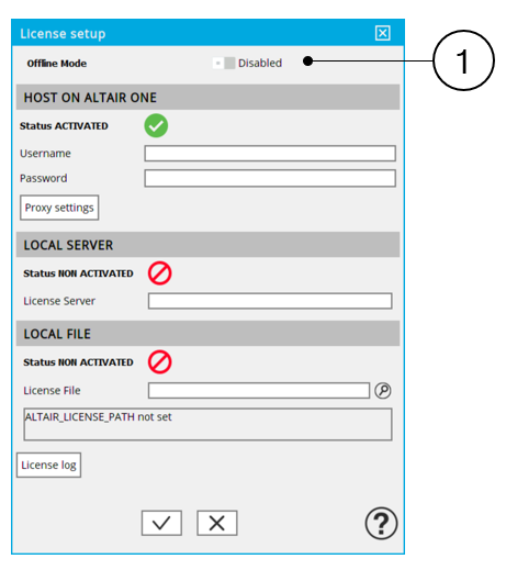 Figure 4. License via Altair One - Dialog box - Enter the Username and Password you created for your Altair One account (Mark 1 - Figure 4 – License via Altair One - Dialog box).