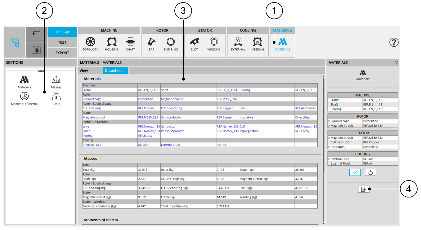| 3 | Material datasheet where materials, masses, moment of inertia and costs are displayed |