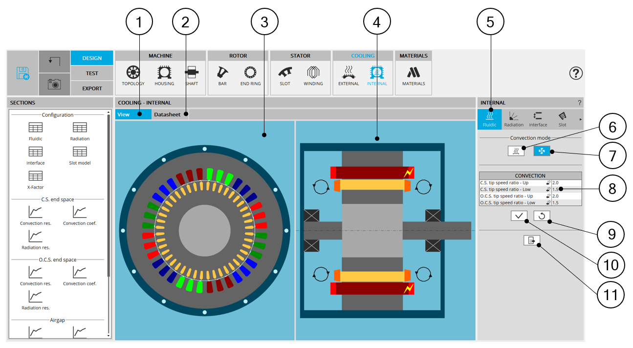 7 Selected button to set that forced convection occurs in the end spaces (a specific fluid flow on each area of the end caps can be specify by the user, that can be linked to the machine rotation speed or not).