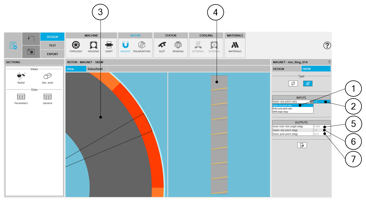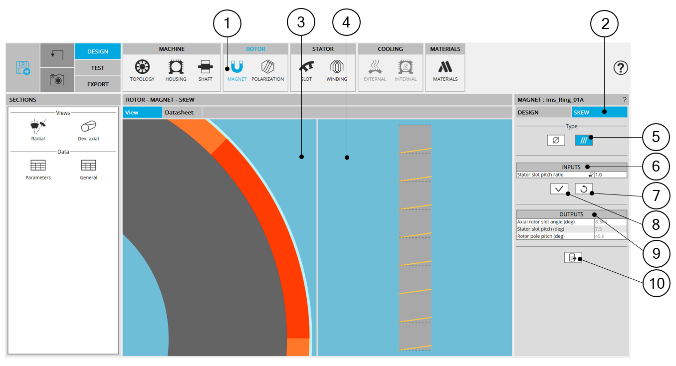 | 2 | SKEW tab indicates the tools to define the rotor (magnet) skewing angle. |