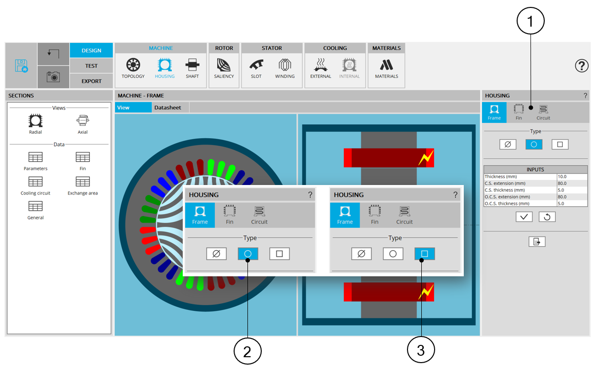 | 1 | The section Circuit (Cooling circuit) is selected to define the type and dimensions of the cooling circuit. |
