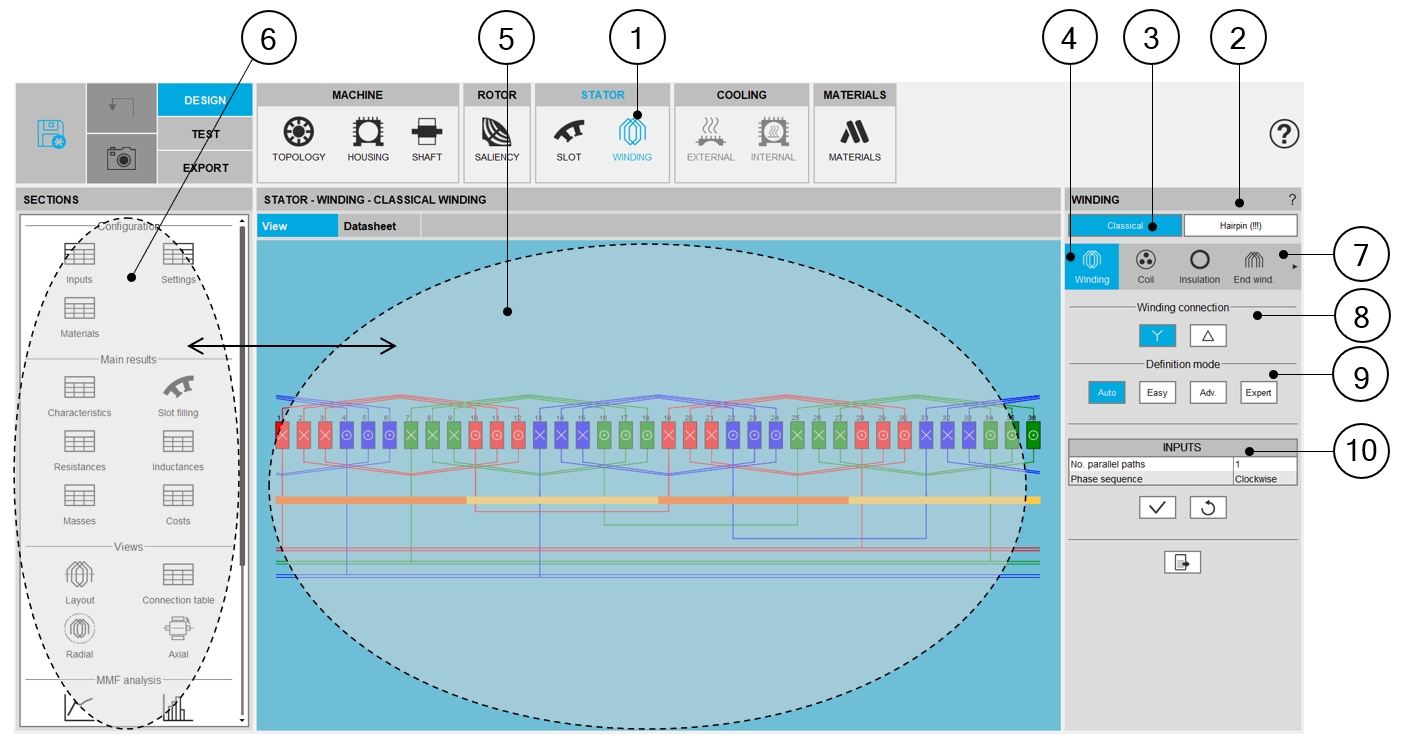For both types of winding, whether classical or hairpin, the home page characteristics are the same. The following picture illustrates the main areas of the home page which is displayed for the classical winding.