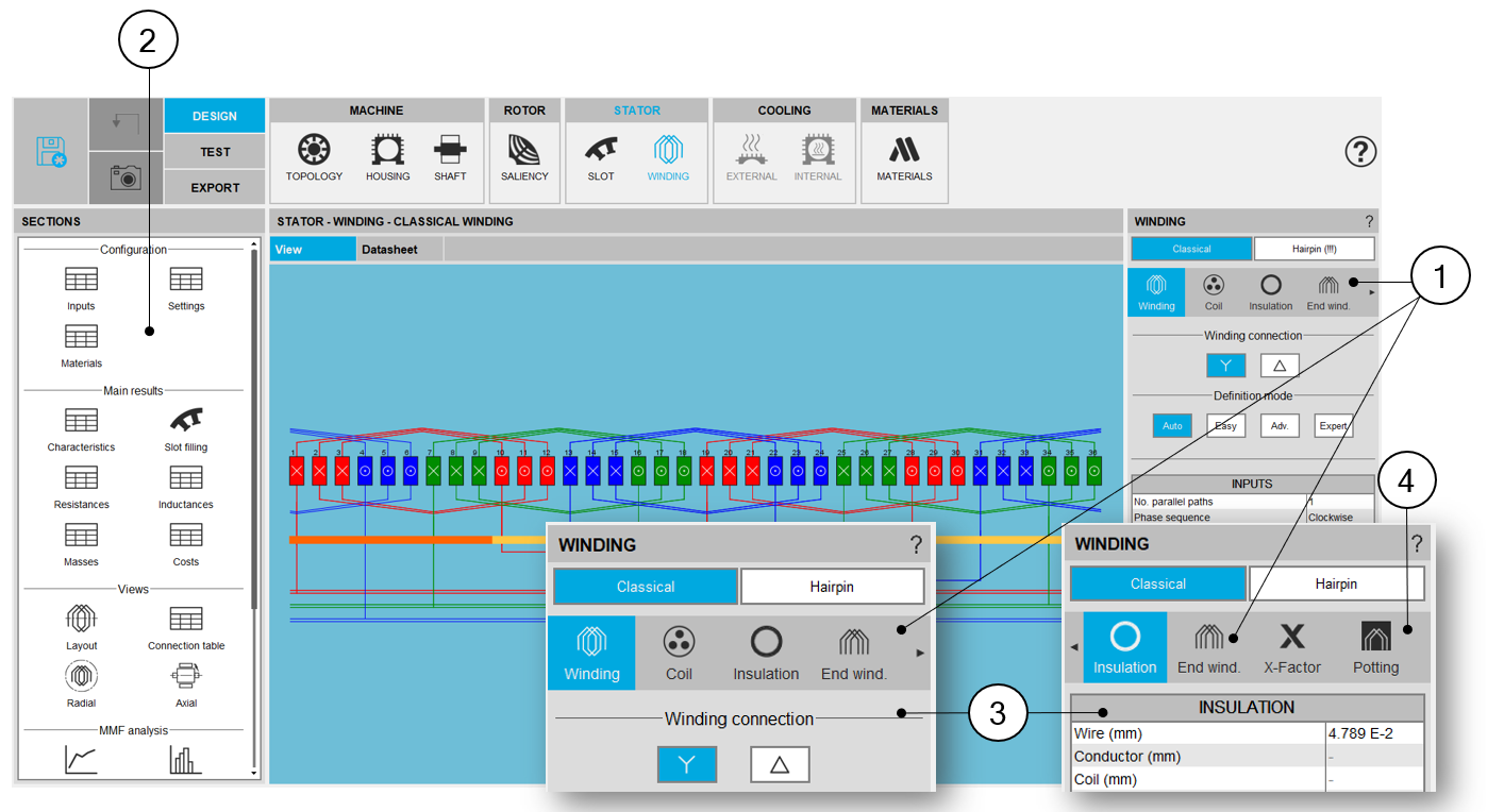 are defined. Scrolling selection bar where Winding architecture, Coil, Insulation, End-winding, X-Factor and Potting sections can be selected |