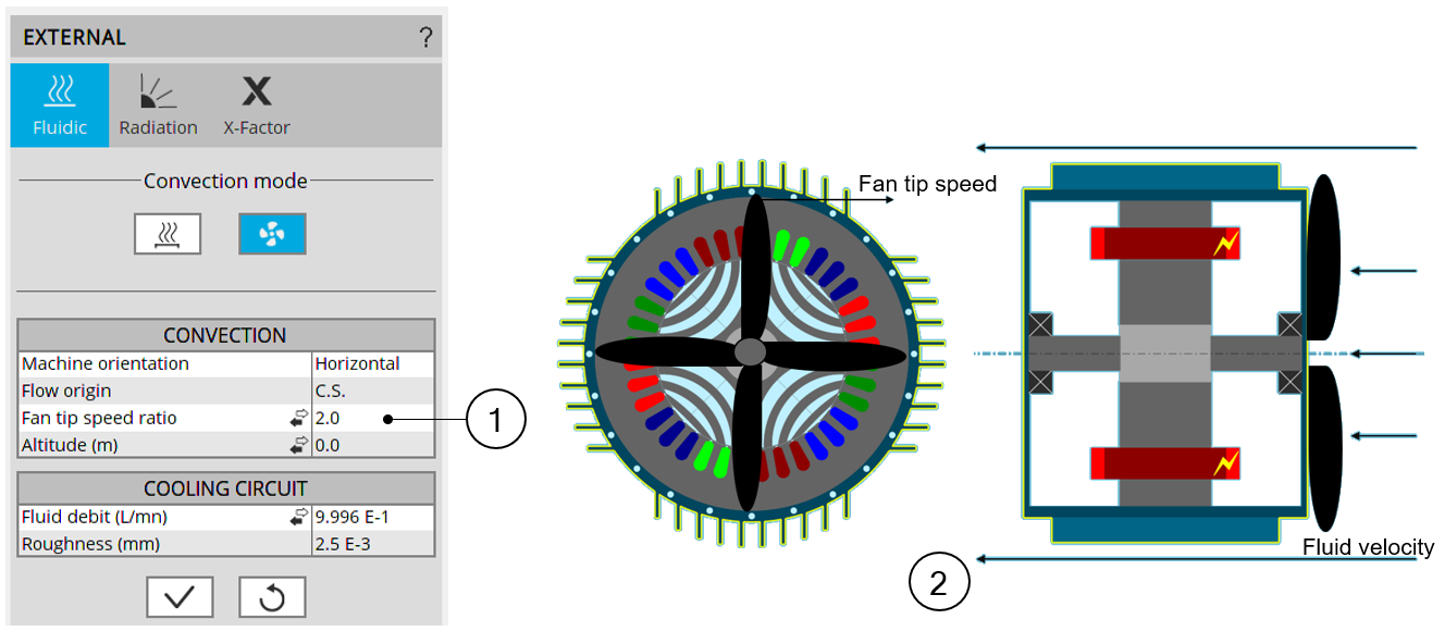 This convection mode allows adding forced convection in addition to the natural convection that always exists. When selecting this mode, the effect of the forced fluid flow around the machine is detailed separately of the natural convection in the results.