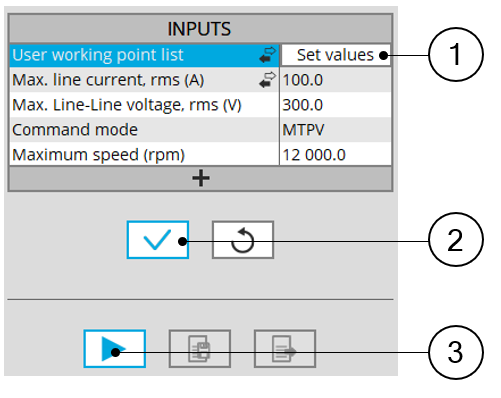 1 Click on the button “Set values” of the field“ User working point list” to define the working points in a dialog box. Refer to the next illustration which shows how to fill the working point table.