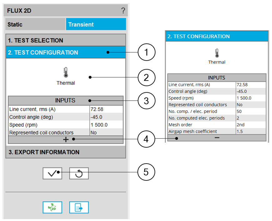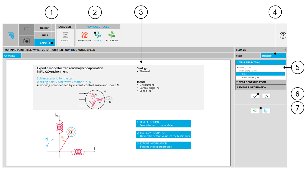Motor Factory – EXPORT AREA – Export model for Flux® 2D environment 1 Select application (STATIC or TRANSIENT) in which the model must be built in Flux® 2D 2 Choose one scenario (or test) to be provided 3 Define the initial conditions for the simulation process in Flux® 2D environment 4 Define export information