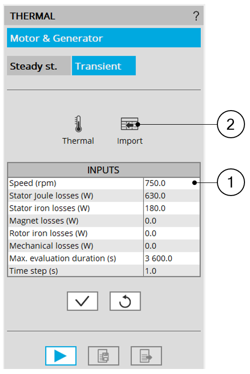 | 1 | Fill in the table to define the speed, all the losses to be considered, the max evaluation duration and the time step. |