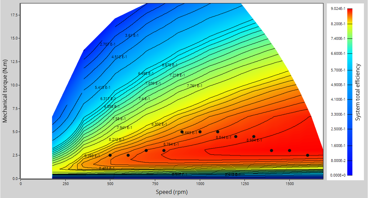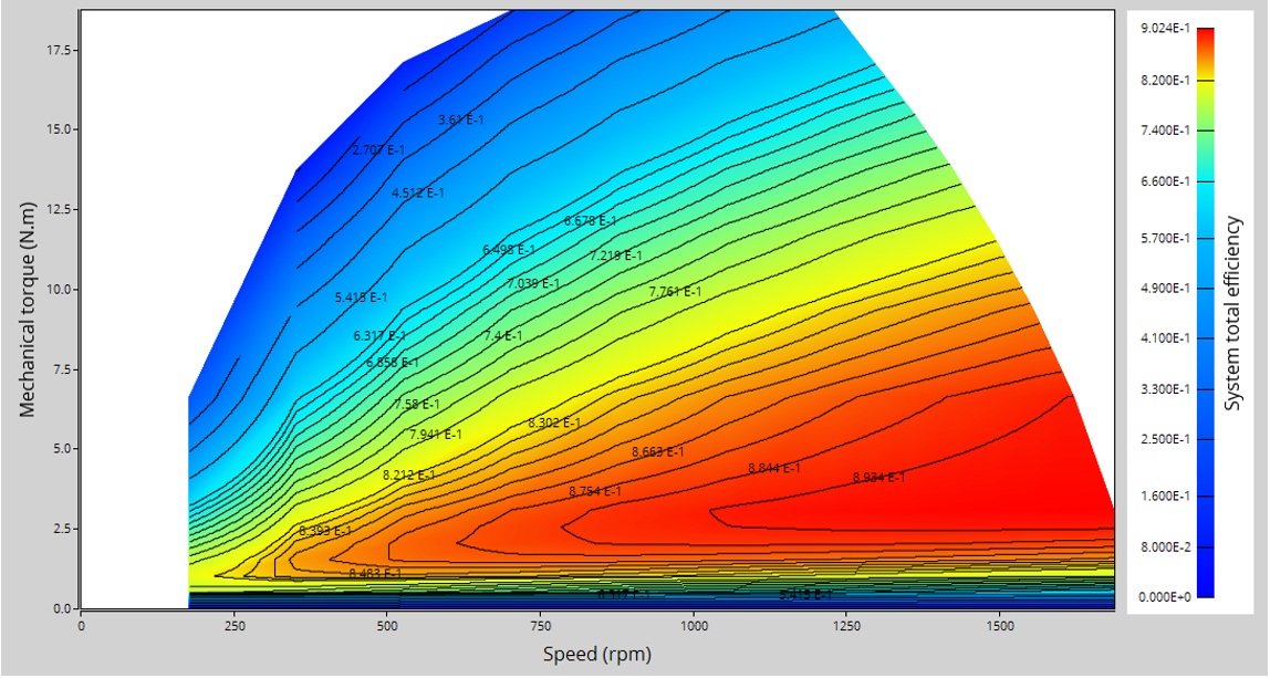 The aim of the test “ Performance mapping – Sine wave – Generator – Efficiency map ” is to characterize the behavior of the machine in the "Torque-Speed" area.