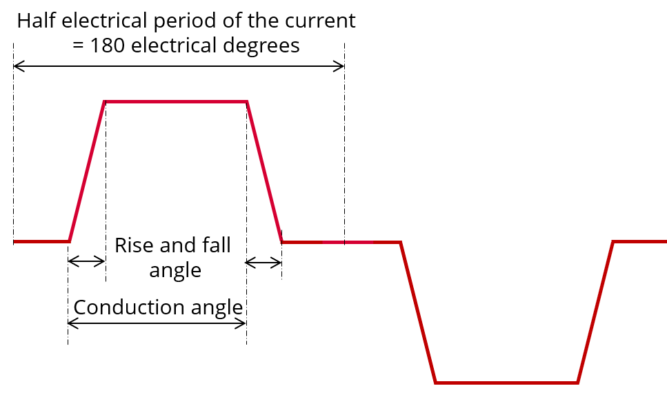 The “ Rise and fall angle ” ( Rise and fall angle of the current in electrical angle ) represents the time constant needed for current rise from 0 to the peak value of the current or current fall from the peak value to 0.