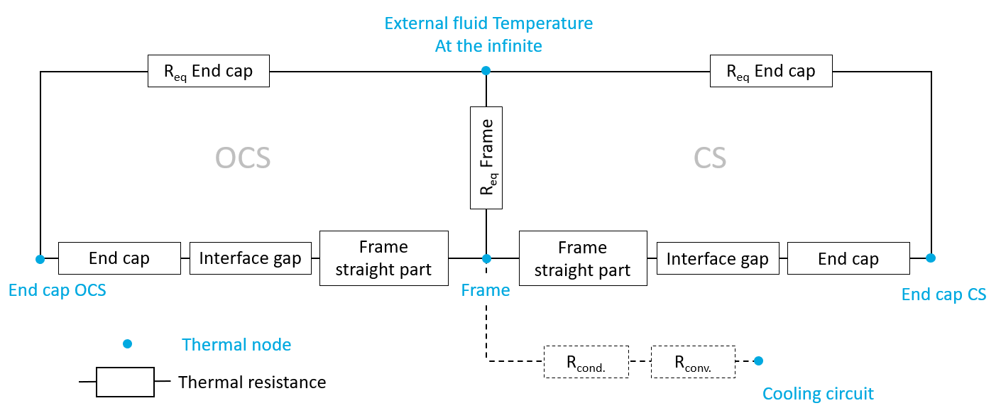 Three main paths extract the heat from the machine to the external fluid, corresponding to three main components: the straight part of the frame, and the two end caps.