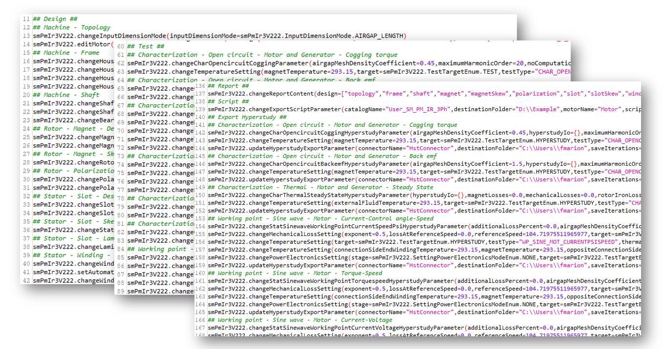 | Example of python script in which are described all the sections to define the design of the motor, the tests and the exports which can be performed |