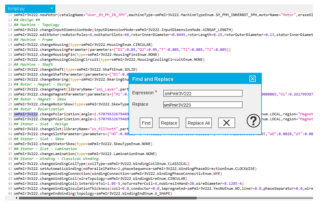 A new function is now implemented in Motor Factory / Export / Document area. Next to the Report, the Script function gives the capability to export a script file in which all the needed command lines are written to rebuild the considered motor.
