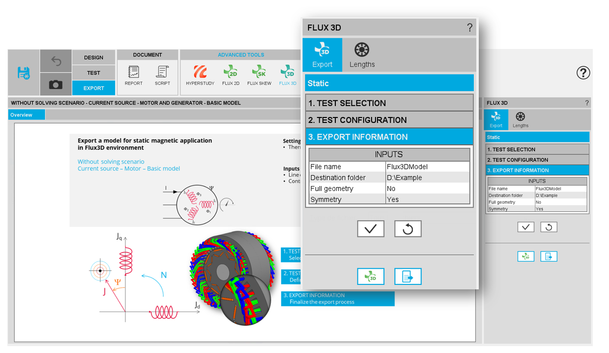 While exporting the project from FluxMotor to Flux 3D, after having defined the project name and the folder in which it must be stored, the user has two possible choices to make:
