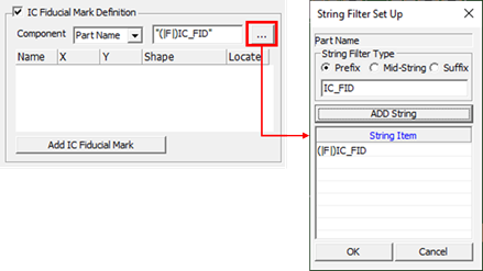 - Component: If the IC Fiducial Mark is designed as a part on the PCB design, it can be recognized using a string filter. Selects string filter conditions from reference name, part name, footprint name, and package name.