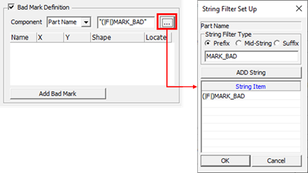 - Component: When bad mark is designed as a part on PCB design, it can be recognized by using string filter. Select string filter conditions from reference name, part name, footprint name, and package name.