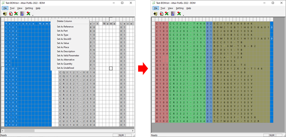 3. Select columns and right-click to define types, such as: reference, part, quantity, and so on.