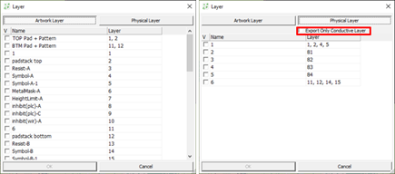 Note: If you select physical layer, Export only conductive layer menu will be enable to include.