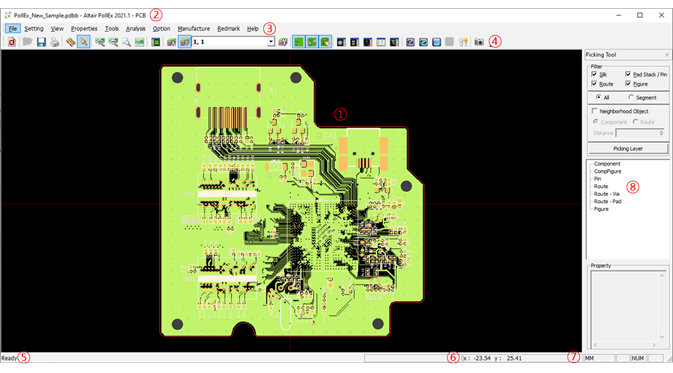 - At the top of main frame window, you can see the version of PollEx PCB and active file name and path.